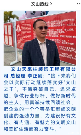 云南天来柱装饰工程有限公司秉持“用心交给自己,让爱温暖家人”的理念,以文化引领、生态支撑为切入点,在市工商联的组织领导下,积极投身到“万企兴万村”活动中,在“多企一村”结对帮扶模式中发挥示范带头作用,参与了创文物资捐赠、建设天来柱希望澡堂、疫情防控物资捐赠、关爱留守儿童公益、重阳节活动、与文山市特殊教育学校签订“爱心服务协议”为其提供业务范围内的无偿维修服务,指导文山市小马场农户建成“寒舍火塘庭院”等10余项公益活动,共计16万元……
